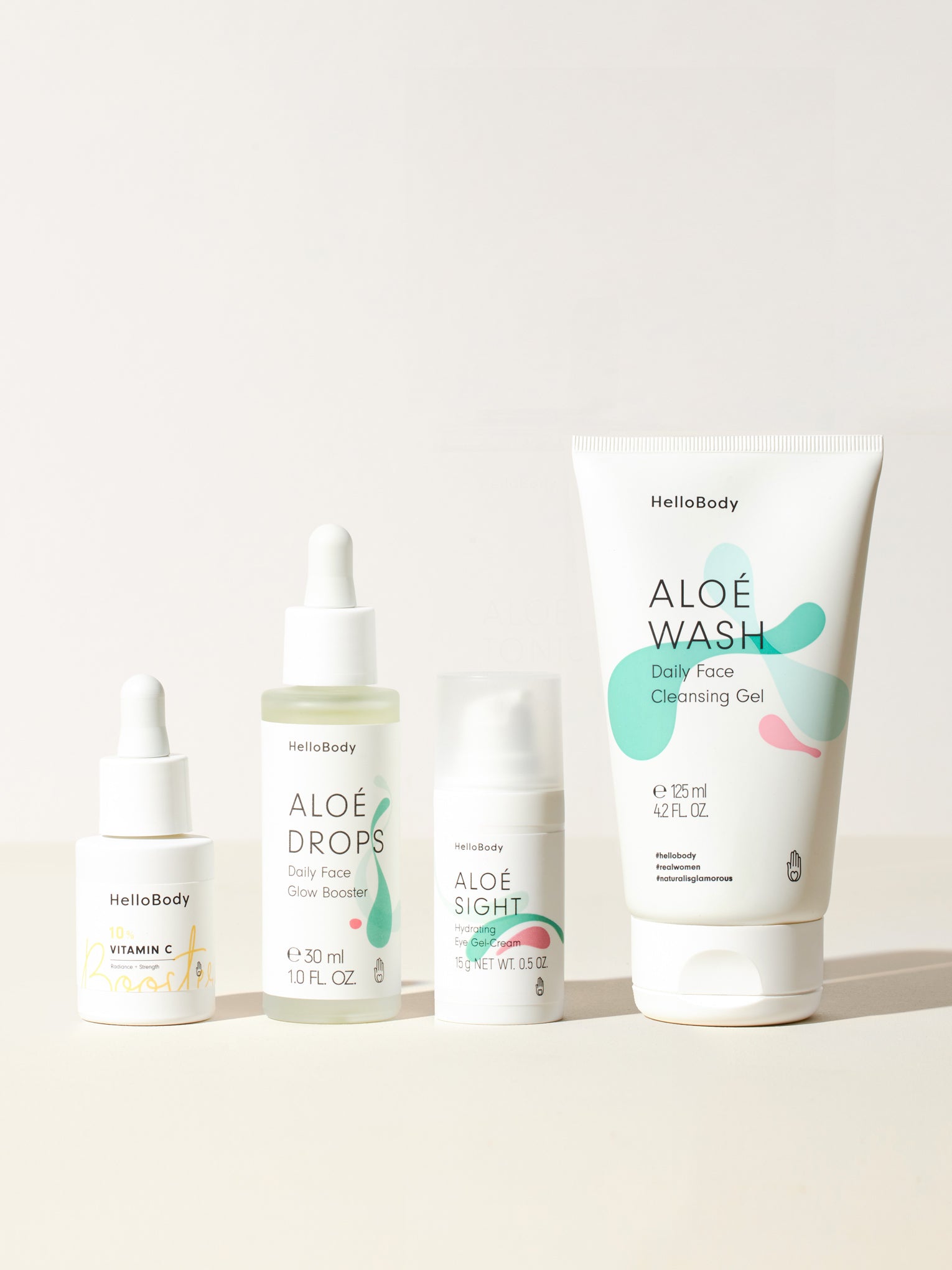 Belebe zuerst deine Haut mit dem ALOÉ WASH Reinigungsgel, einem wahren Frischekick für die Haut. Revitalisiere anschließend deine Haut mit unserem 10% VITAMIN C BOOSTER für einen strahlenden Teint. Hol dir den Glow und erhalte die Feuchtigkeit deiner Haut mit unserem Glow Booster ALOÉ DROPS. Deine sensible Augenpartie pflegst und nährst du mit unserer Augencreme ALOÉ SIGHT.