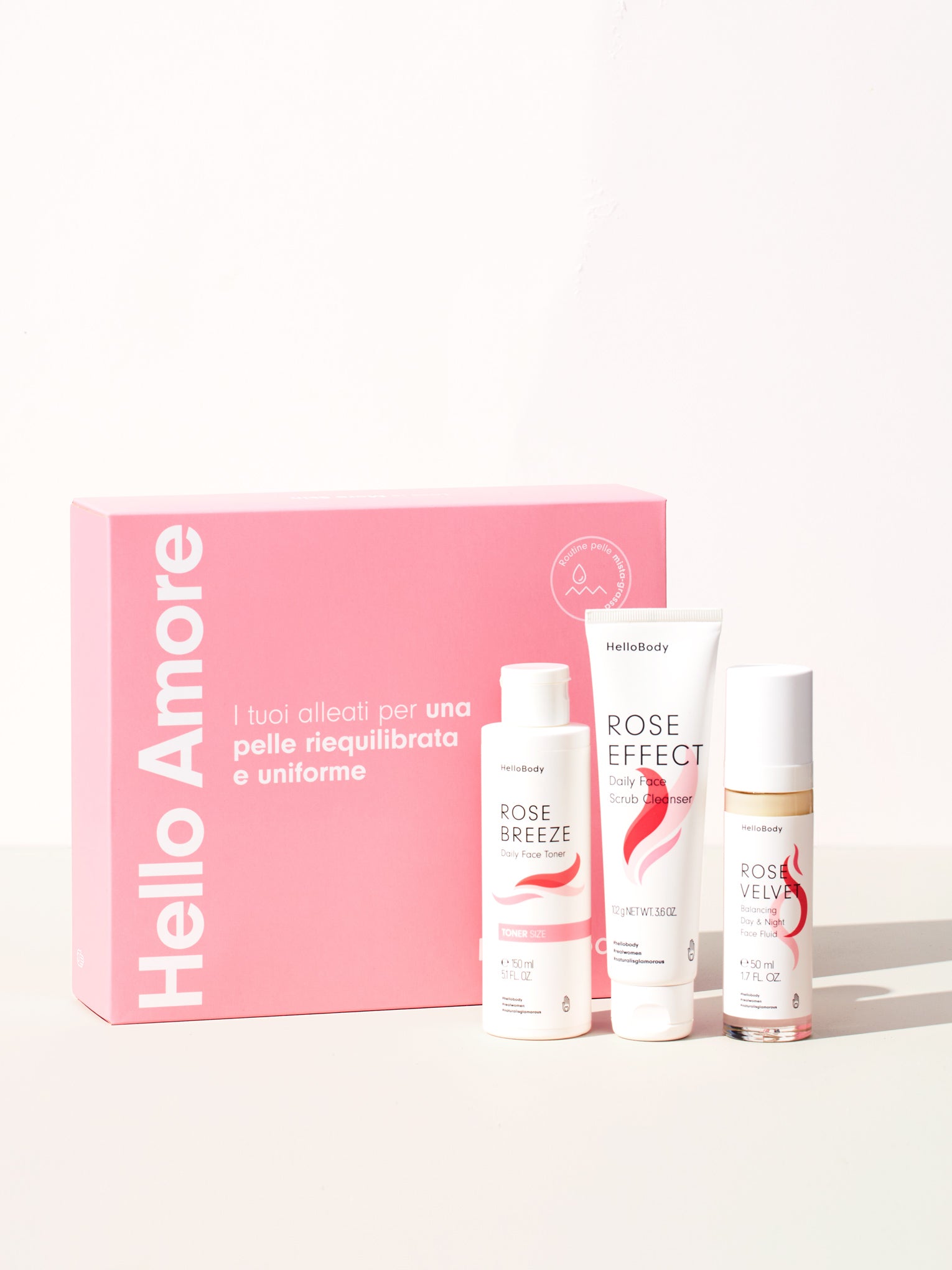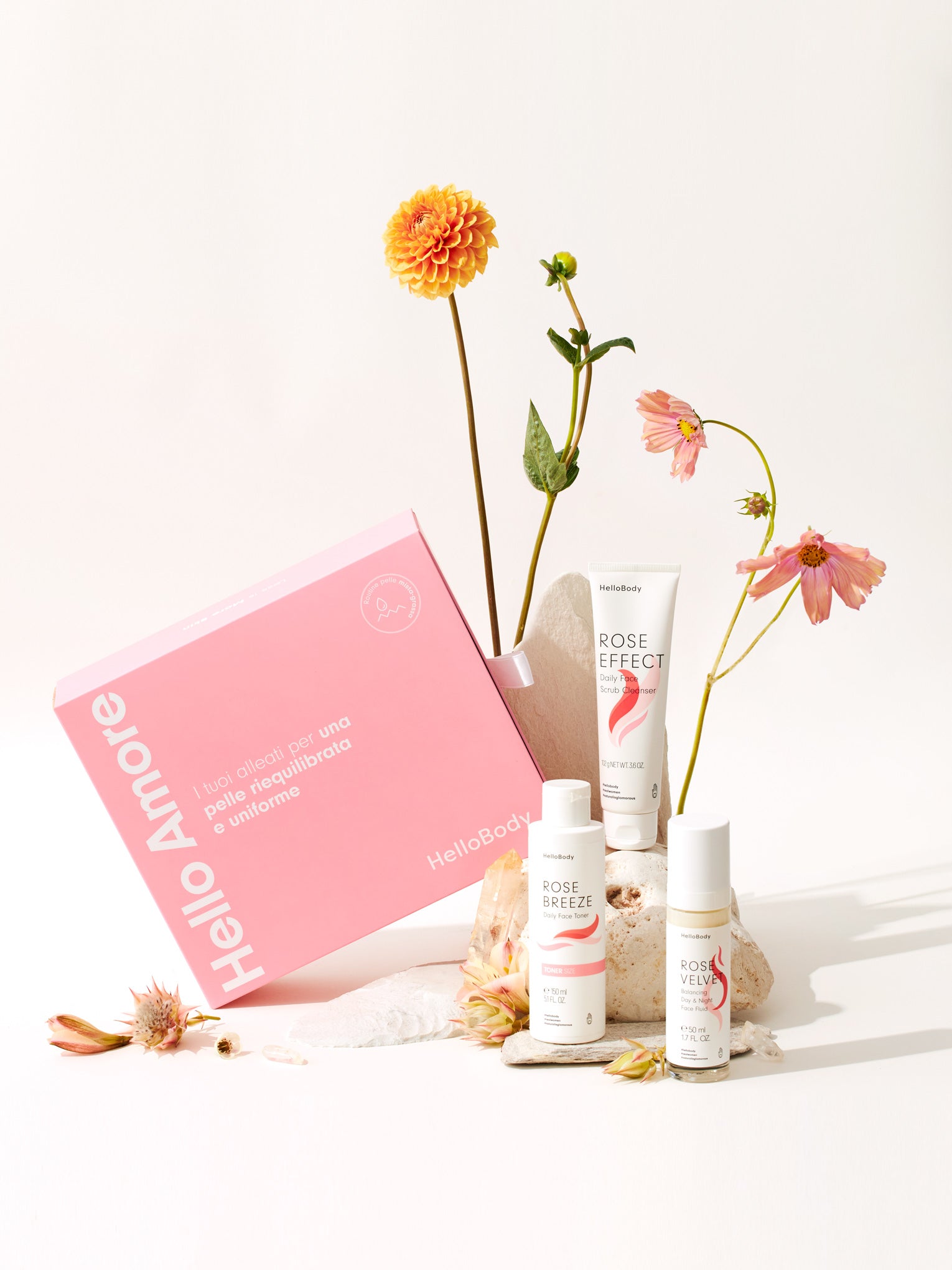 Lass dich vom Charme unserer ROSE EFFECT Reinigungscreme betören, welche Unreinheiten und Öle von der Haut entfernt und somit ein frisches Gefühl hinterlässt. Verfeinere deine Routine mit ROSE BREEZE, einem Gesichts-tonic mit Rosenwasser, welches den pH-Wert der Haut ausgleicht. Genieße die samtig weiche Textur von ROSE VELVET, einem Gesichtsfluid, das deine Haut mit beruhigenden Inhaltsstoffen ausgleicht und somit für ein ebenmäßiges Hautbild sorgt. Erlebe die Freude von La Dolce Vita mit diesem strahlenden Trio.