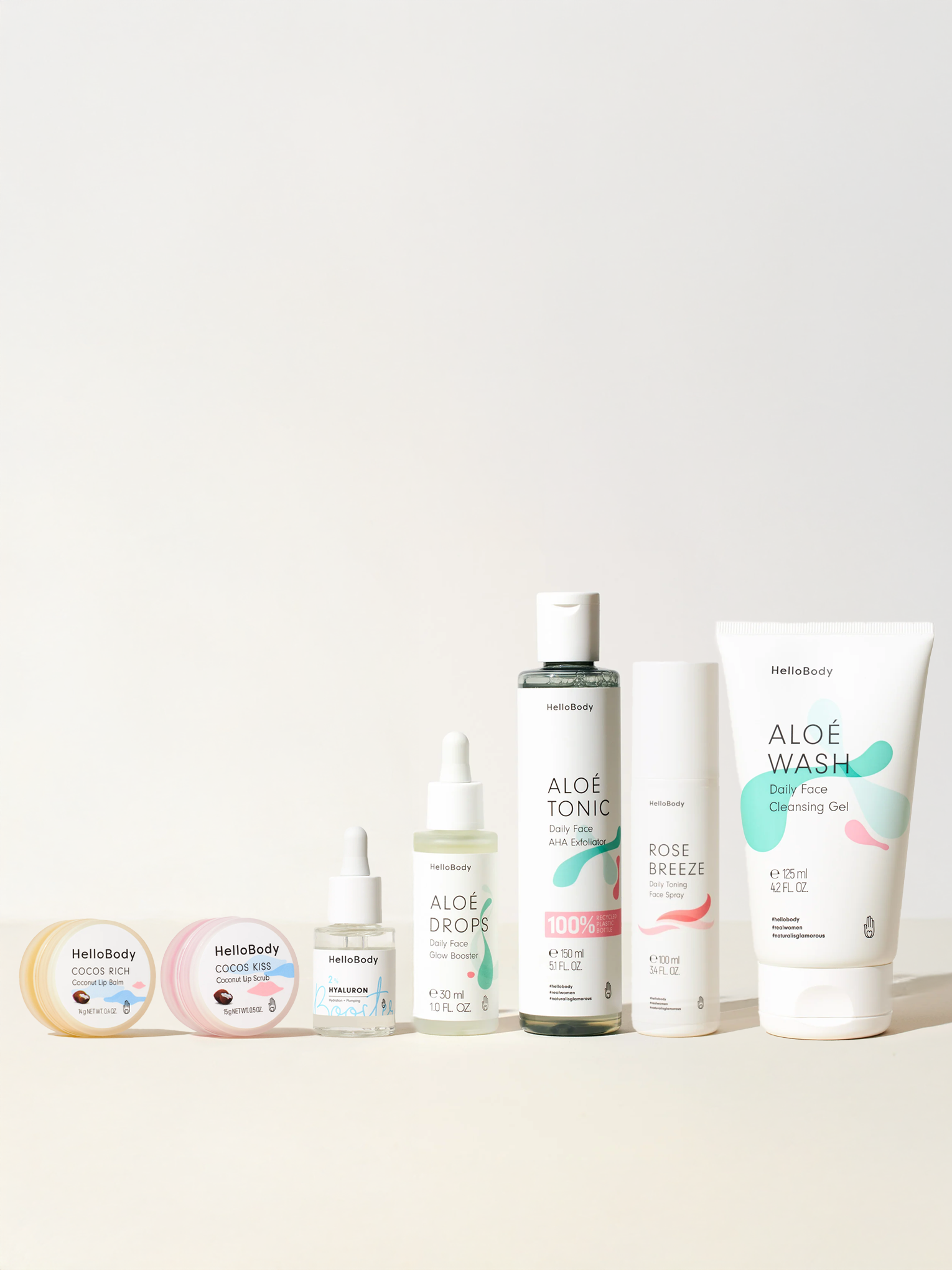 - Mit Reiniger, AHA-Peeling, Glow Drops, Gesichtsspray, Lippenpeeling, Lippenbalm