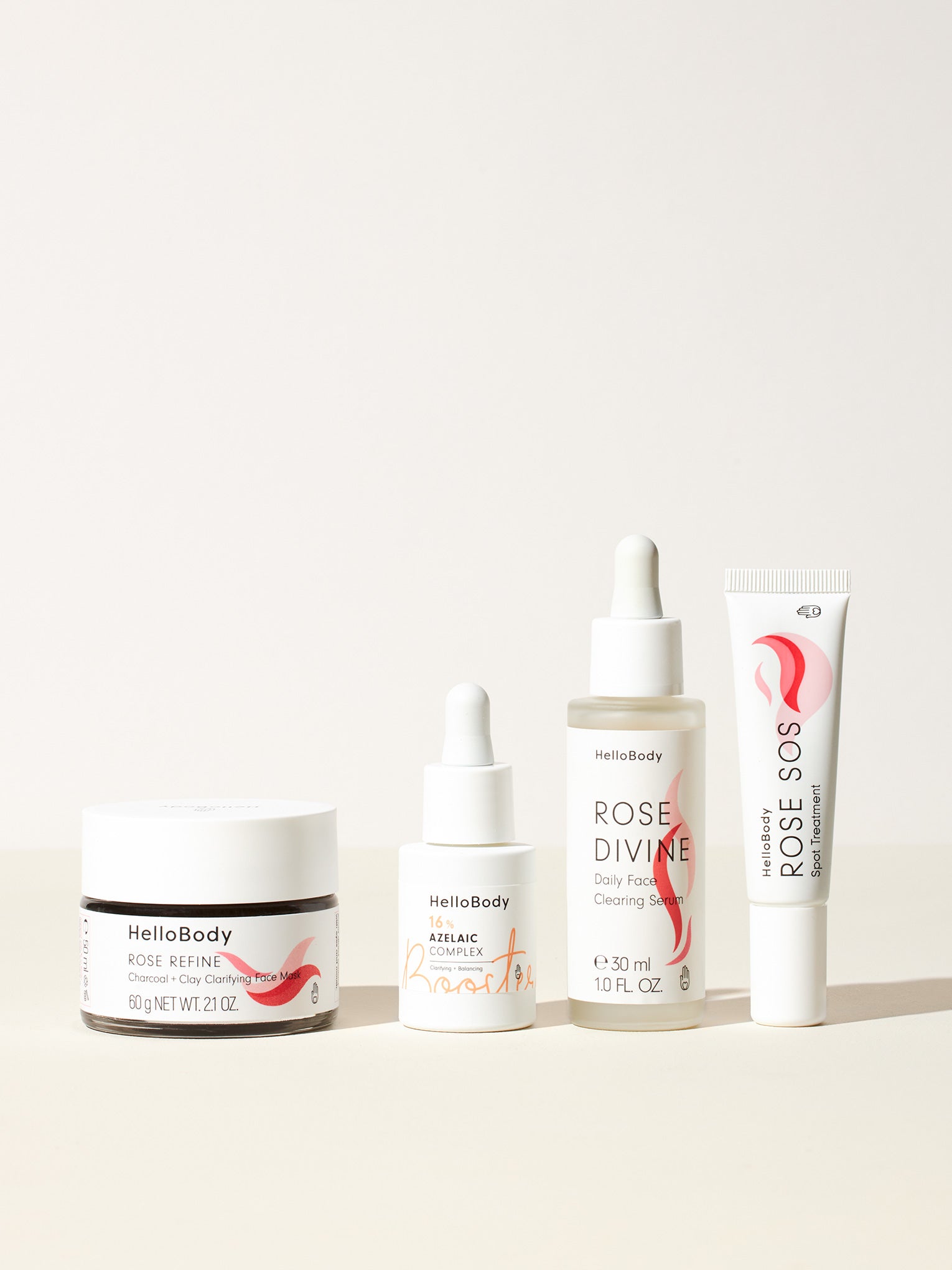 Verwöhne deine Haut zweimal pro Woche mit unserer Gesichtsmaske mit Tonerde und Holzkohle, ROSE REFINE, welche die Poren tiefenwirksam klärt und zu einem verfeinerten und ebenmäßigen Teint verhilft. Reguliere nach der Tiefenreinigung die Talgproduktion mit unserem 16% AZELAIC COMPLEX Booster. Bei Pickel-Notfällen ist unser anti-spot treatment ROSE SOS da, um den Tag zu retten! Nimm einfach den Deckel ab und sieh dabei zu, wie die Pickel verschwinden.