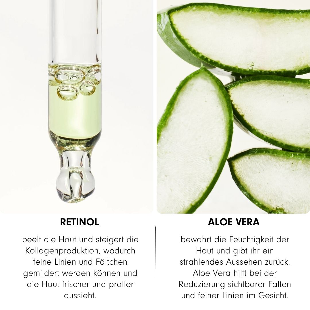- Retinol (0,25%) und Retinylacetat (0,95%) helfen dabei, Falten zu reduzieren und den Hautalterungsprozess zu verlangsamen